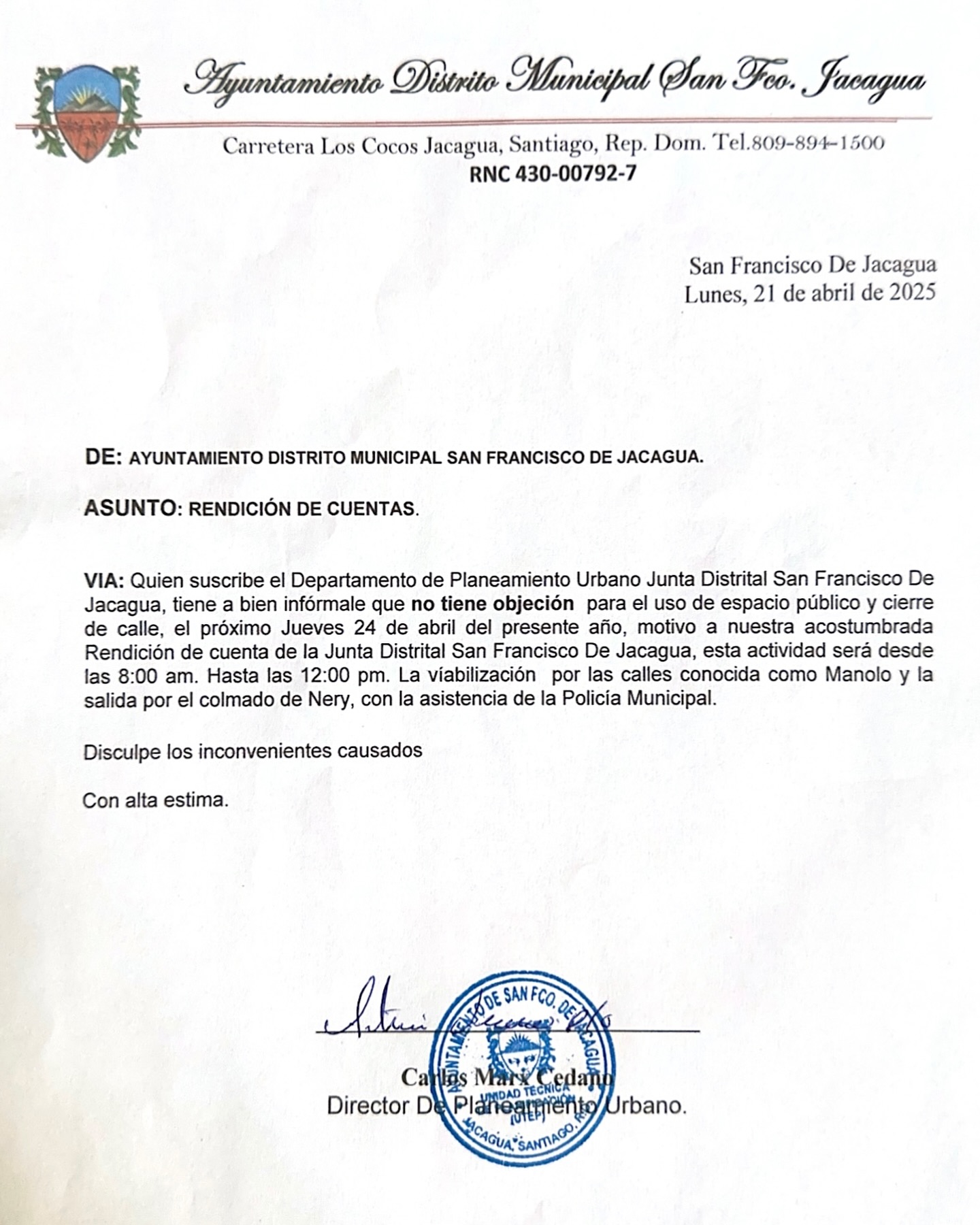 Este jueves 24 de abril en la calle principal de los cocos de jacagua, estará cerrado el tramo ( Calle Manolo saliendo al colmado Nery ) en horario de 8:00 am. hasta las 12:00 pm.
