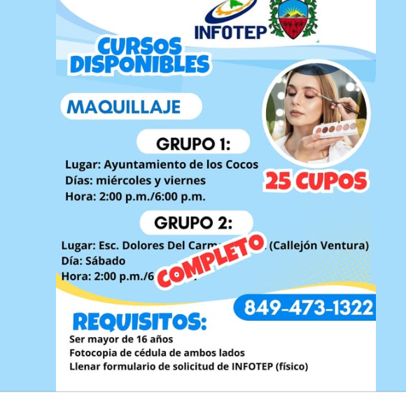El Ayuntamiento, en coordinación con INFOTEP, pone a disposición de la comunidad el curso de maquillaje, una oportunidad de formación para desarrollar nuevas habilidades y abrir puertas al emprendimiento.