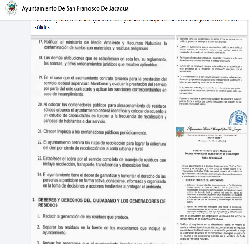 abril 2, 2025 Derechos y deberes de los ayuntamientos y de los munícipes respecto al manejo de los residuos sólidos. Comparte y Comenta