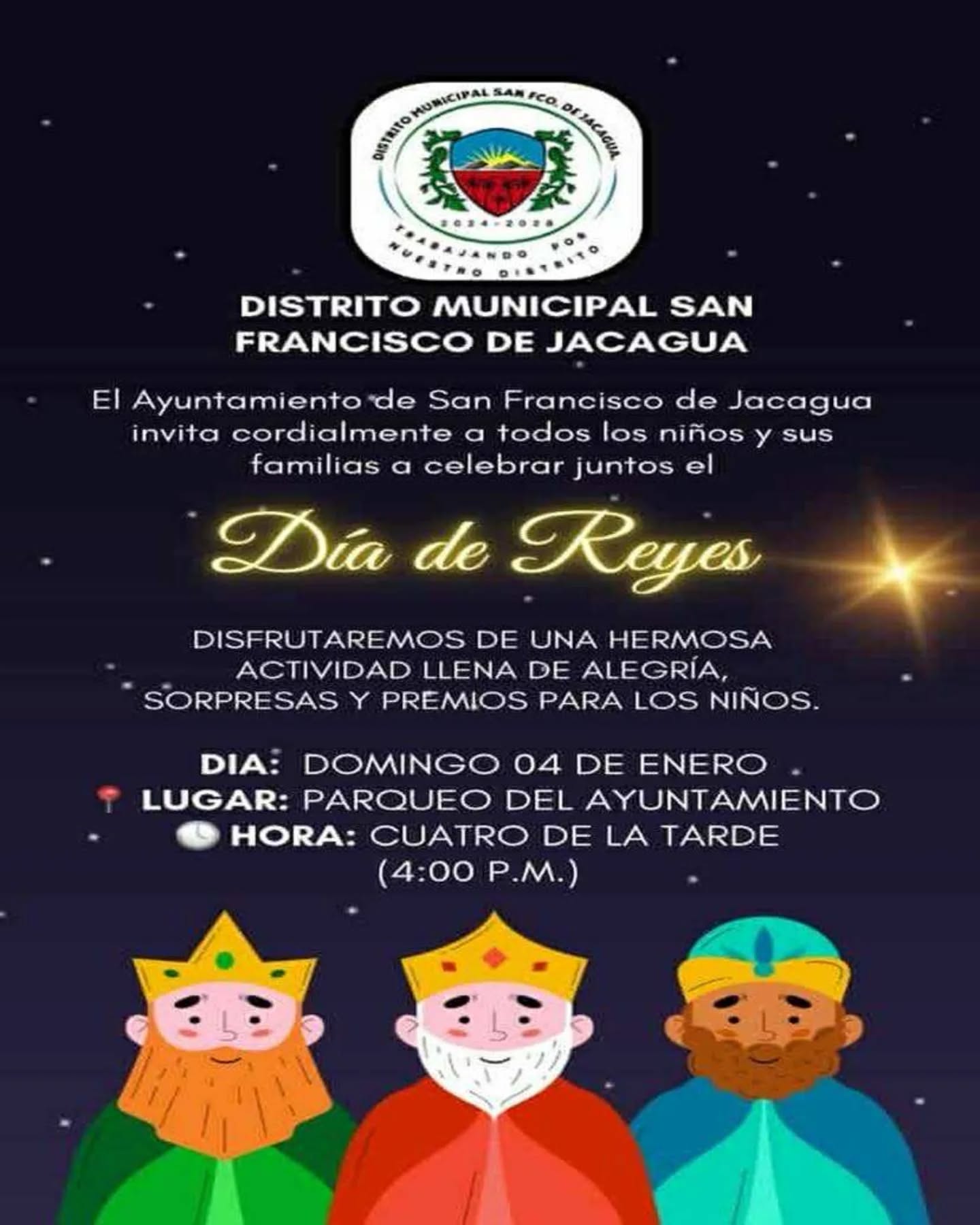 El Ayuntamiento del Distrito Municipal San Francisco de Jacagua tiene el honor de invitar cordialmente a todos los niños y a sus familias a celebrar juntos el tradicional Día de Reyes, una tarde llena de alegría, diversión y momentos inolvidables.