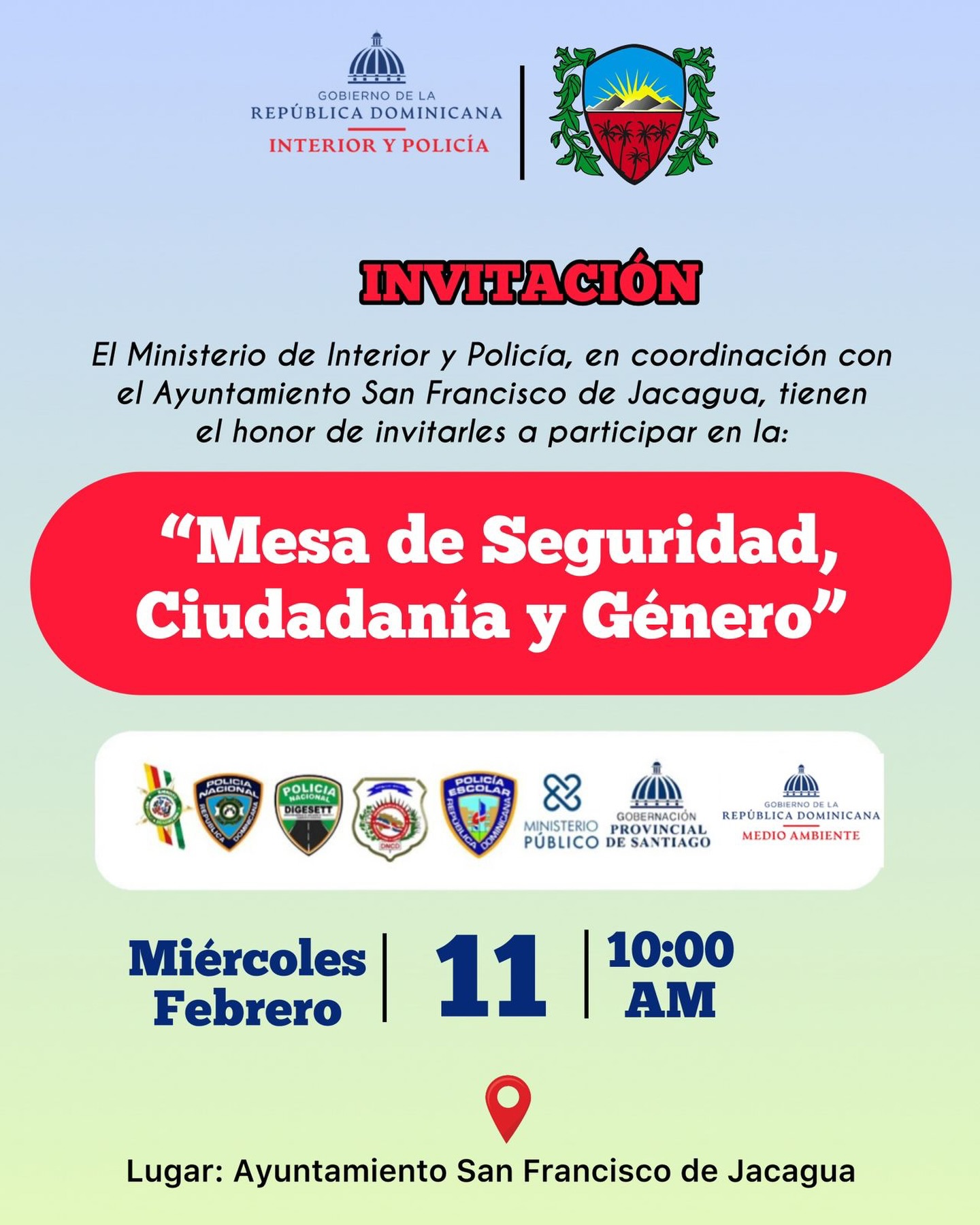 El Ministerio de Interior y Policía, en coordinación con el Ayuntamiento de San Francisco de Jacagua, invita a toda la ciudadanía a participar en la Mesa de Seguridad, Ciudadanía y Género, un espacio de diálogo y trabajo conjunto orientado a fortalecer la seguridad, la convivencia pacífica y el bienestar de nuestras comunidades.