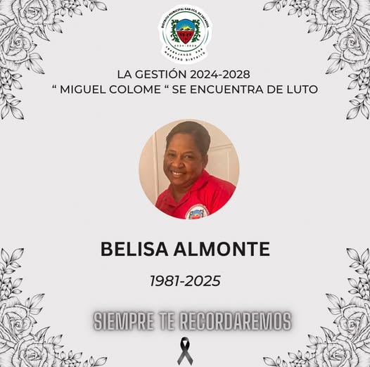 LA GESTIÓN 2024-2028 MIGUEL COLOME, SE ENCUENTRA DE LUTO, YA QUE NUESTRA QUERIDA COMPAÑERA DE TRABAJO “ BELISA ALMONTE “ DONDE DESEMPEÑABA LA FUNCIÓN DE ENCARGADA DEL DEPARTAMENTO DE ARCHIVO, FUE ESCOGIDA POR DIOS PARTIENDO ASÍ AL REINO DE LOS CIELOS EN CUANTO A SU VOLUNTAD, YA QUE HACE UNOS MESES TENÍA UNA COMPLICACIÓN DE SALUD.