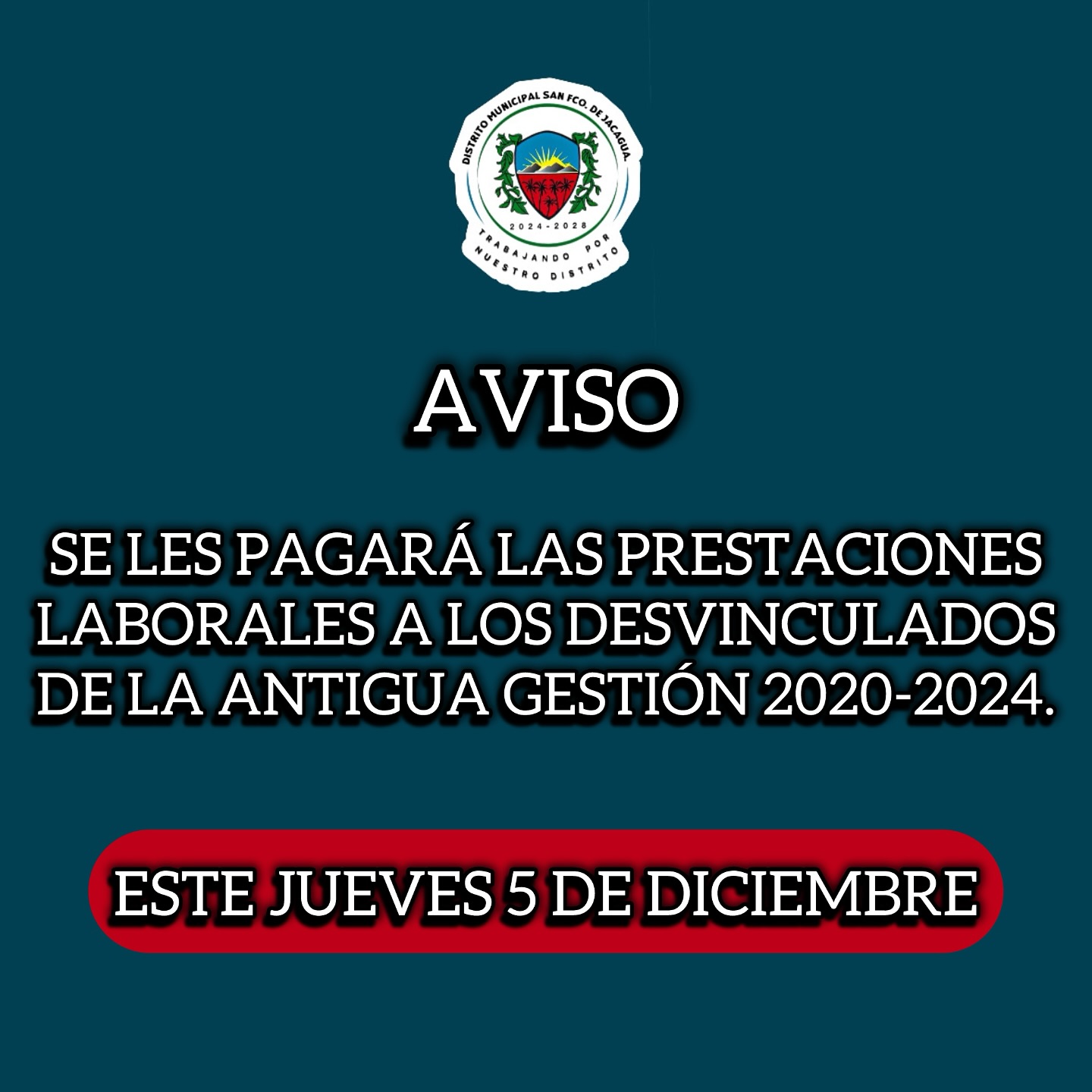NUESTRA GESTIÓN 2024-2028 MIGUEL COLOME, COMO INSTITUCIÓN RESPONSABLE ANUNCIAMOS CON MUCHO ENTUSIASMO QUE SE LE PAGARÁ LAS PRESTACIONES LABORALES A TODOS LOS DESVINCULADOS DE LA GESTIÓN PASADA 2020-2024 ESTE JUEVES 5 DE DICIEMBRE. SEGUIREMOS HACIENDO LAS BUENAS ACCIONES PARA UN MEJOR DESARROLLO PARA NUESTRO DISTRITO.